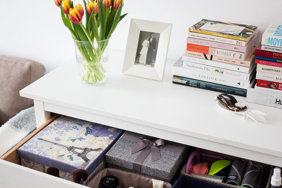 Koszyki i pudełka wykorzystuję także jako organizery do szuflad, w których trzymam swoje kosmetyki. Pamiętajcie, by nie przechowywać kolorówki w łazience, ponieważ panuje tam duża wilgoć i nasze cienie, sypkie pudry będą ją chłonęły. Mogą też szybciej zepsuć się i stać siedliskiem dla bakterii i grzybów. Ja swoje kosmetyki przechowuję w komodzie w pokoju gościnnym, do której oprócz kolorówki wkładam także kosmetyki do pielęgnacji, które czekają na otwarcie. Podczas porządków, wyjmuję wszystko z pudełek, przecieram je wilgotną szmatką, segreguję każdy produkt, pozbywam się kosmetyków, które się nie sprawdziły lub ich terminy przydatności dawno minęły, myję pędzle i przecieram paletki.